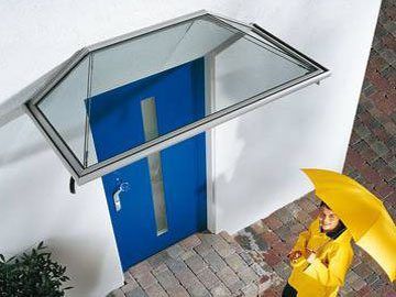 Das Vordach besteht aus einer wetterfesten Glas-Aluminium-Konstruktion, bei der die Aluminiumprofile farbig beschichtet werden können.